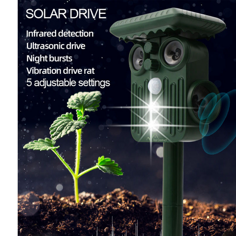 • 5 ADJUSTABLE MODES - The first mode is 13.5KHz-19.5KHz, which is used to scare away dogs and mice. The second mode, 19.5KHz-28.5KHz, is used to scare away cats and moles. The third mode, 400Hz-1000Hz, is used to scare away snakes and mice. The fourth mode is LED flashing, which is used to scare away birds and wild boars. The fifth mode is frequency conversion and LED flashing, which is used to scare away all animals including deer.